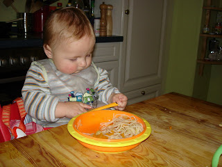 Seit dem Wutz essen wir regelmäßiger. Ich esse morgens so gegen halb neun mit ihm Frühstück, dann so gegen 12.30/13.00 Uhr zu Mittag, so gegen 18.30 gibt es für uns drei Abendbrot. Wir essen in der Küche, weil da auch der Hochstuhl steht. Heut abend essen wir beim Fischröllchenmacher :-)